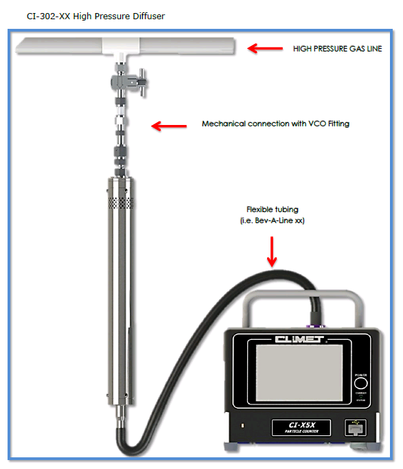 測(cè)試點(diǎn)的位置應(yīng)在高壓管路的調(diào)節(jié)器和 HEPA 過(guò)濾器之后。導(dǎo)管長(zhǎng)度應(yīng)為 10 英尺,以減少與聲波相關(guān)的高計(jì)數(shù),且不得有急彎(下圖僅供演示)。Climet 建議與 1 CFM、50 LPM、75 LPM 或 100 LPM 流量的顆粒計(jì)數(shù)器或微生物采樣器配合使用。